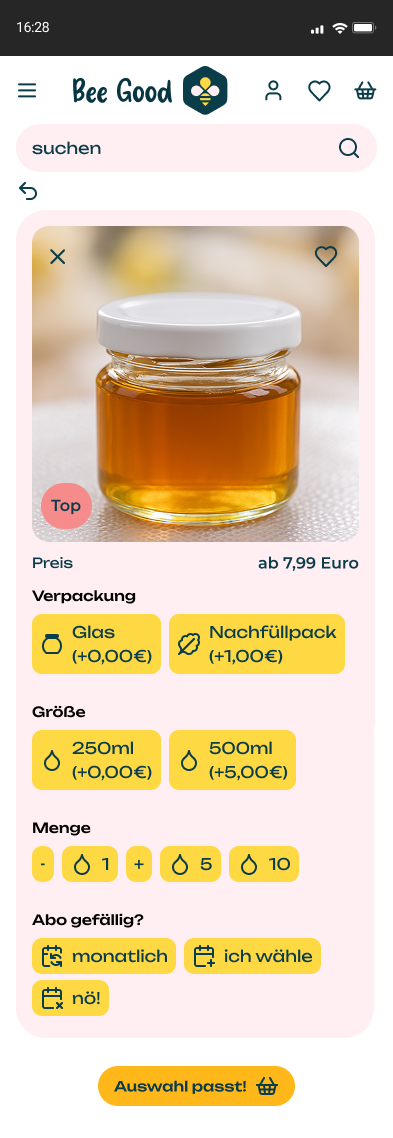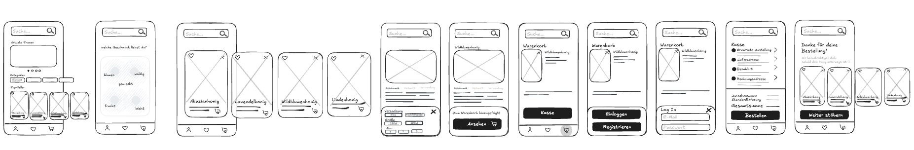 Als Honigliebhaber:in möchte ich Honig nach meinem Geschmack und von kleinen Imker:innen kaufen können, damit ich weiß, woher mein Produkt kommt und ich die Arbeit der Bienen wertschätzen kann.
